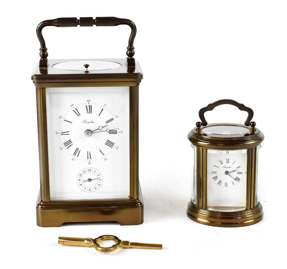 Lot 132 of 966: An Angelus French brass chiming carriage clock, the circular enamelled dial set with Arabic and Roman numerals and subsidiary seconds dial, the jewelled movement back plate stamped 'L Epee 1889', with bevelled glass, height excluding swivel handle 13cm, with key, also a smaller table clock of barrel form with five bevel glazed windows, the circular enamelled dial set with Roman numerals (2).