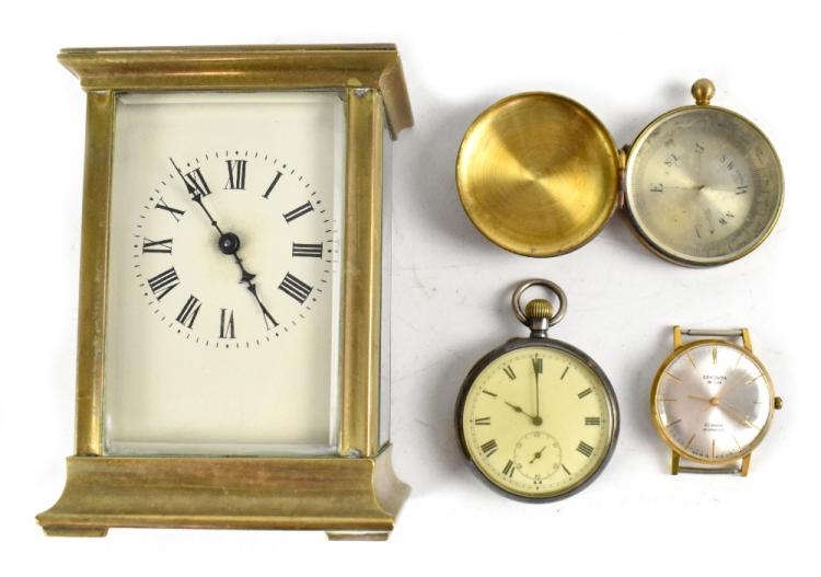 Lot 133 of 966: An early 20th century brass carriage clock, the circular enamelled dial set with Roman numerals, with twin drum movement and back plate stamp 'R & Co Made in Paris', with bevelled glass, height including swing handle 14.5cm, with key, together with a crown wound open face silver pocket watch, the enamel dial set with Roman numerals and small subsidiary seconds dial, a pocket compass and a Sekonda deluxe watch head (4).