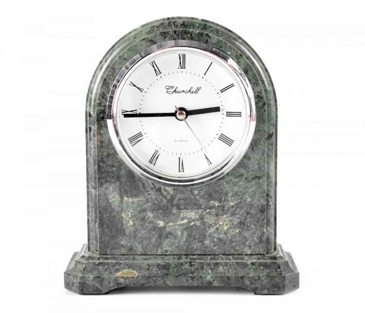 Lot 136 of 966: A Churchill green marble mantel clock with Art Deco inscribed stepped plinth base, the white dial set with Roman numerals, height 17cm.