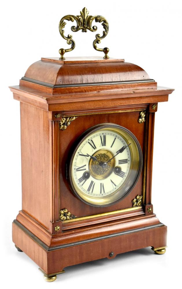 Lot 138 of 966: H A C; an early 20th century German fourteen-day strike mantel clock, the enamelled and gilded dial set with black Roman numerals, height 36cm.