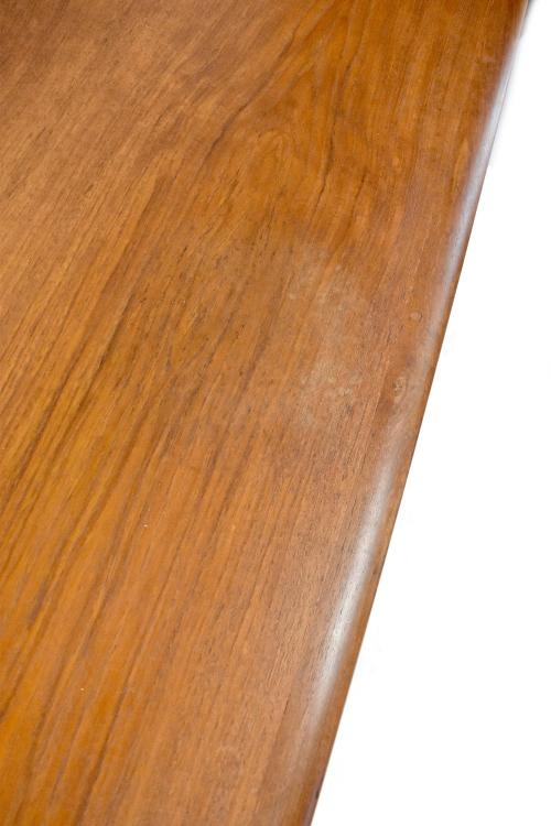 Lot 1 of 898: A Dalescraft, retailed by Matthews, 1960s retro teak dining suite comprising an extending dining table with three additional leaves stored inside, extended 73 x 286cm, six rail back dining chairs upholstered in black and white woven fabric and a sideboard with four drawers and a pair of sliding cupboard doors, on round tapering legs, 79 x 198 x 46cm.