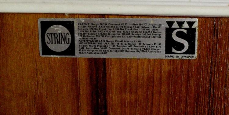 Lot 2 of 898: A 1960s retro teak string modular wall hanging system comprising a cupboard and drawer unit, a fall front unit (af), seven shelves of two sizes and six wire wall attachments, maker's labels to most parts, overall height 77cm, width of each modular compartment 80cm.