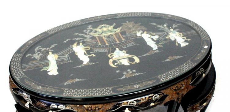 Lot 8 of 898: A modern Japanese black lacquer and Chinoiserie decorated table inlaid with hardstone scene of musicians in a landscape, height 52cm, width 121cm, with four matching triangular topped stools (5).