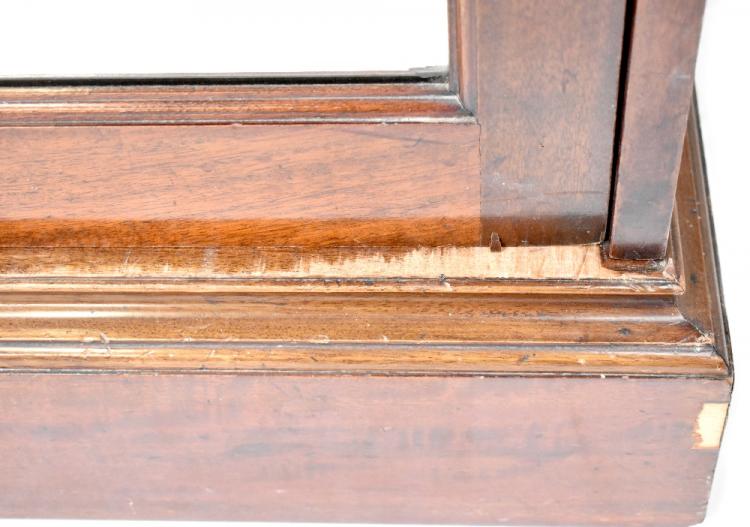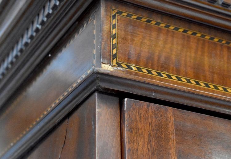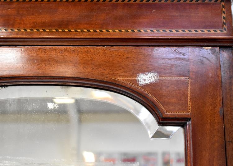 Lot 36 of 898: An Edwardian inlaid mahogany triple compactum wardrobe with pair of cupboard doors enclosing a single shelf, above four graduated drawers flanked by mirrored doors, on a plinth base, height 215cm, width 206cm, depth 58cm.