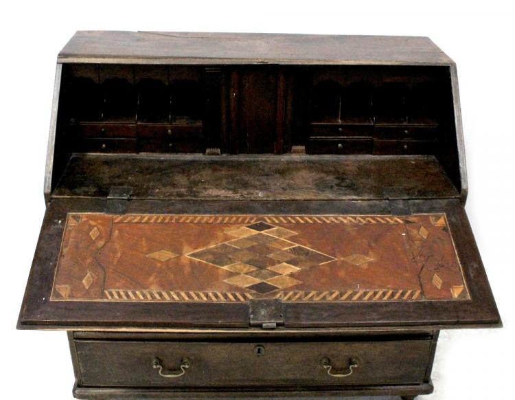 Lot 51 of 898: A George III mahogany bureau for restoration, the fall front revealing a fitted interior with reeded column hidden drawers and marquetry inlaid writing surface, above two short and three long graduated drawers, on bun feet, height 107cm, width 107cm, depth 53cm.