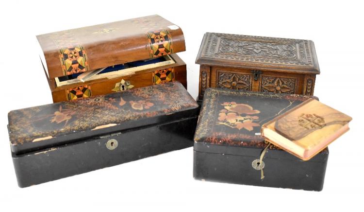 Lot 106 of 898: A small collection of boxes to include an Indian-style carved jewellery box with small coral beads, key and an olive bound Common Prayer Book, a 19th century walnut sewing box with coloured marquetry and central mother of pearl floral design, a papier-mâché glove box and an Oriental-style jewellery box (4).