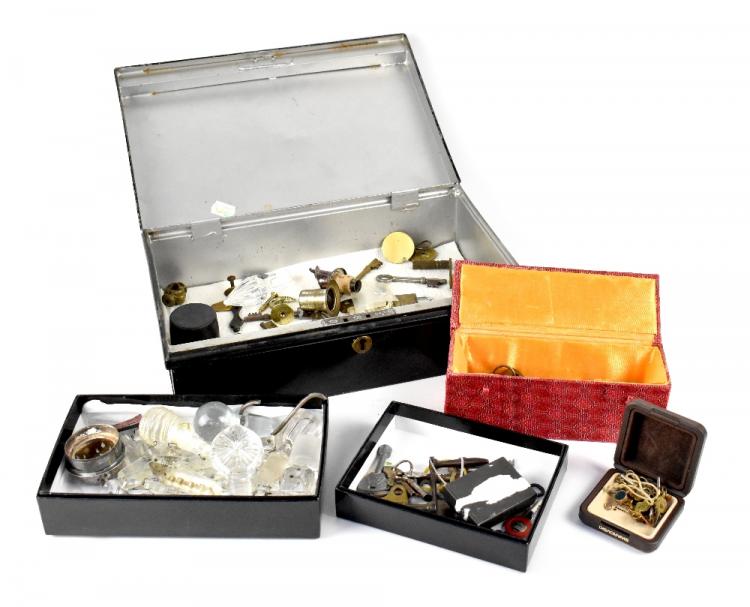 Lot 107 of 898: A black metal cash box containing a quantity of various clock and other keys, a small quantity of keys for pocket watches, various vintage cut glass bottle tops, crystal drops, bottle measures, etc.