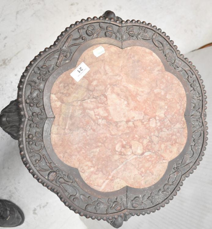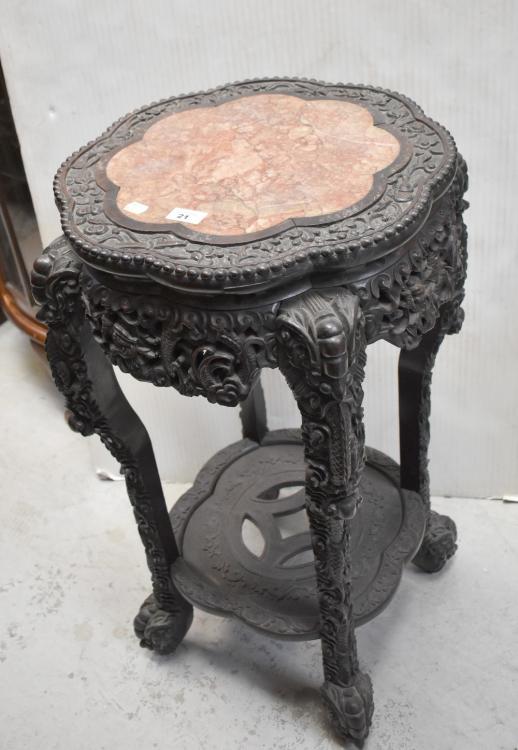 Lot 21 of 837: A late 19th century Chinese carved hardwood urn stand with pink marble insert top, on a profusely carved base with undershelf, height 81cm, diameter 43cm.