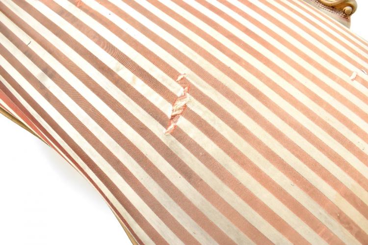 Lot 23 of 837: A Victorian gilt painted chaise longue with scrolled back, upholstered in a striped pink and cream material, length approx 200cm.