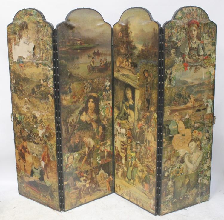 Lot 26 of 837: A Victorian four-panel scraps screen with scenes of hunting, children's stories and many others, each panel 180 x 60cm.