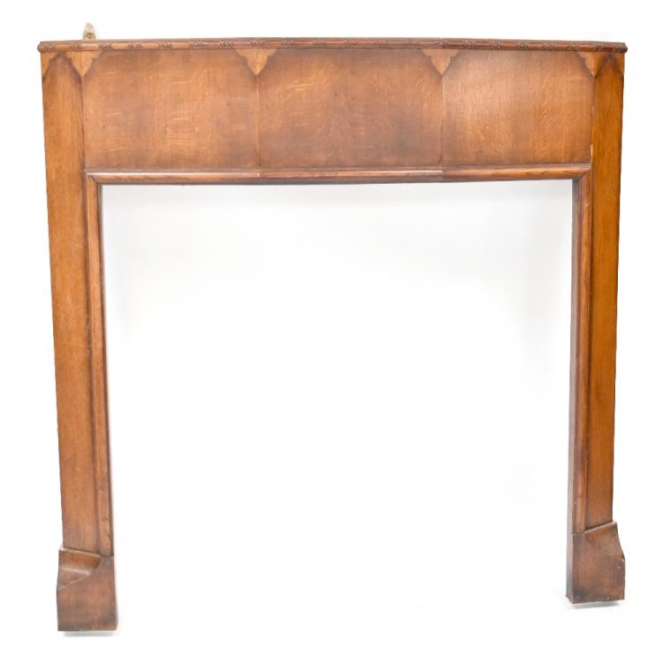 Lot 41 of 837: Two Edwardian non-matching wooden fire surrounds, one oak in the Arts and Crafts style, 134 x 120cm, and one mahogany example with narrow shelf above column supports (2).