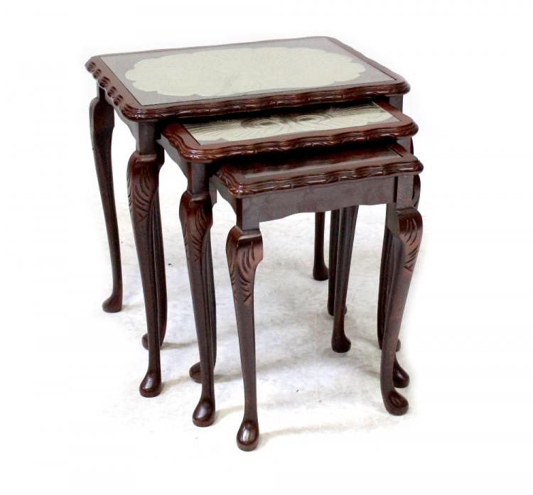 Lot 65 of 837: A modern mahogany nest of tables with glass tops and a matching coffee table on cabriole legs (2).