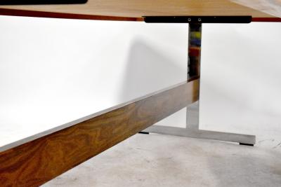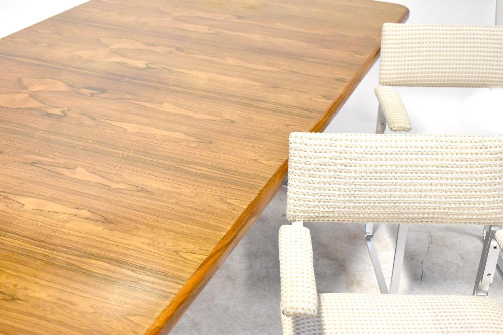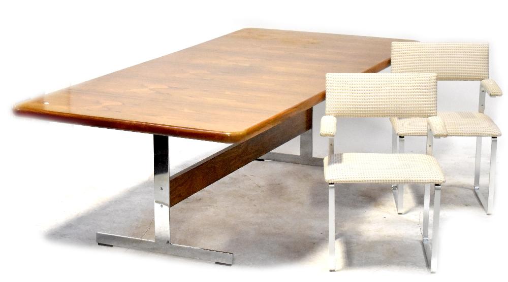 Lot 75 of 837: A 1960s rosewood dining table of rectangular form on chrome supports united by a rosewood stretcher, 73 x 214 x 114cm, and a set of eight metal framed dining chairs each with upholstered back, arm and seat in woven cream fabric (9).
