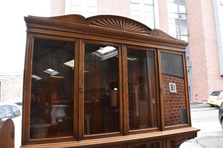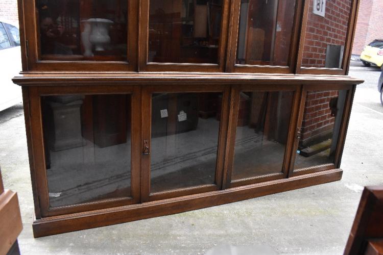 Lot 2 of 1291: A large late Victorian oak bookcase with shell carved pediment above four glazed doors enclosing adjustable shelves, above a base of four further glazed doors enclosing adjustable shelves, raised on a plinth base, 258 x 251 x 38cm.