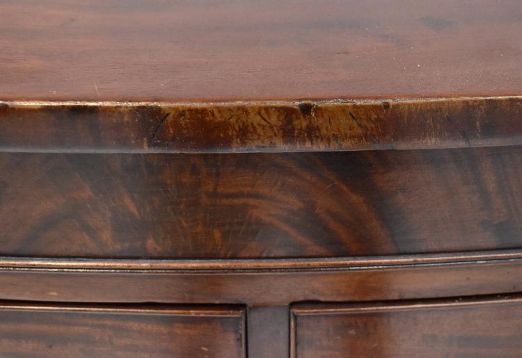 Lot 8 of 1291: A 19th century Scottish mahogany bow-fronted chest of two short over three long graduated drawers, with turned wooden handles, on outswept bracket feet, 115 x 122 x 57cm.
