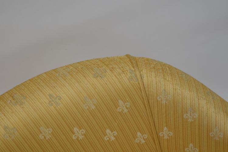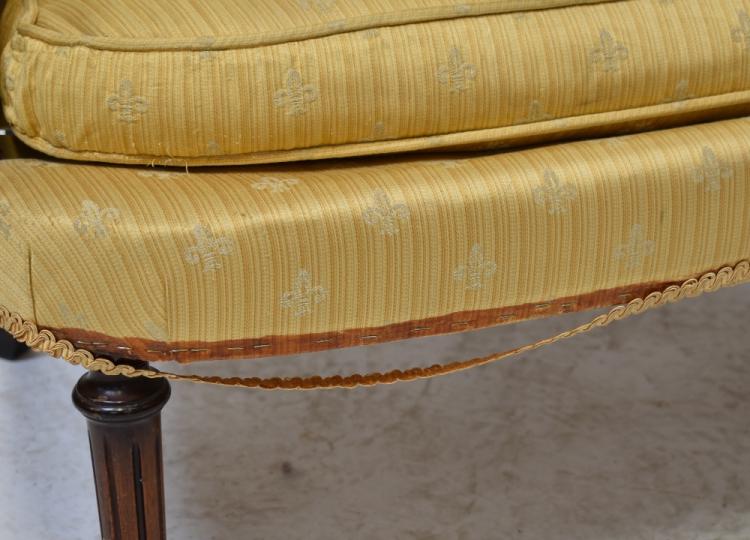 Lot 23 of 1291: A Victorian mahogany bow-back settee of small proportions, with scroll arms, upholstered in a yellow material with woven fleur-de-lis motifs, on turned fluted tapering legs, length 116cm.