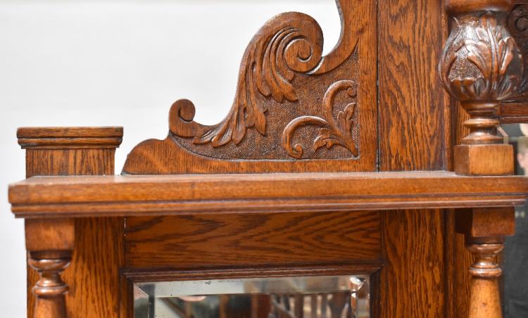 Lot 27 of 1291: A large Victorian carved oak mirror back sideboard, the upper section mounted with a broken swan neck pediment carved with acanthus leaf decoration above triple bevelled mirror plates, with an assortment of shelves and carved acanthus leaf baluster supports, above a base with bowed central section comprising two drawers above two fielded panelled doors flanked by a drawer above a further fielded panelled door, raised on turned feet, with profuse swag, urn and acanthus leaf carving, 230 x 184 x 5