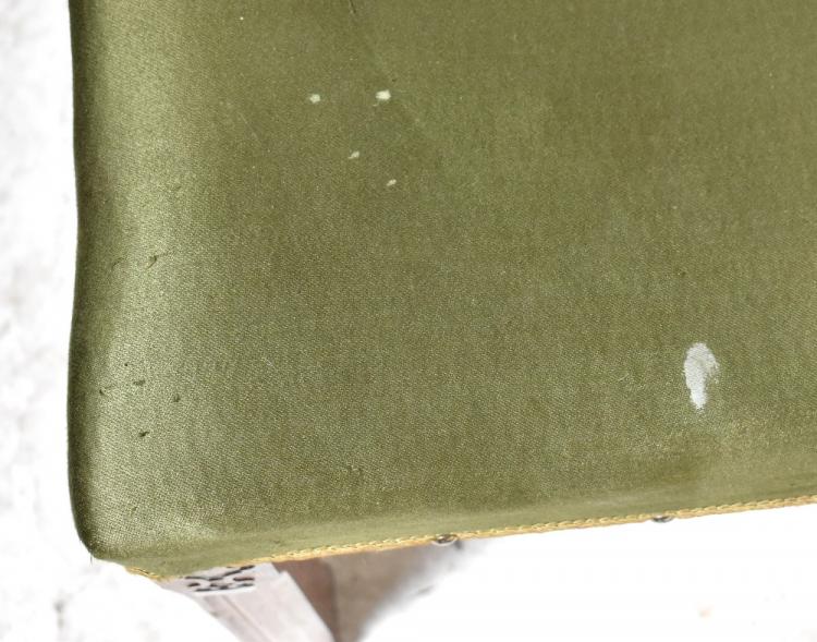 Lot 60 of 1291: A 19th century mahogany stool, upholstered in a green fabric, with studded brocade, on square fluted legs with scroll detail, 47 x 54 x 39cm.
