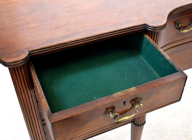 Lot 71 of 1291: An early/mid-20th century mahogany Regency-style sideboard, one long central drawer with three drawers to either side, on eight fluted tapering supports to peg feet, 96 x 198 x 60cm.