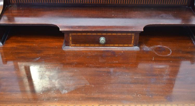 Lot 74 of 1291: An early 20th century inlaid mahogany dressing chest, the mirror with bevelled plate above a small central drawer, above three long drawers and raised on bracket feet, 147 x 84 x 53cm.