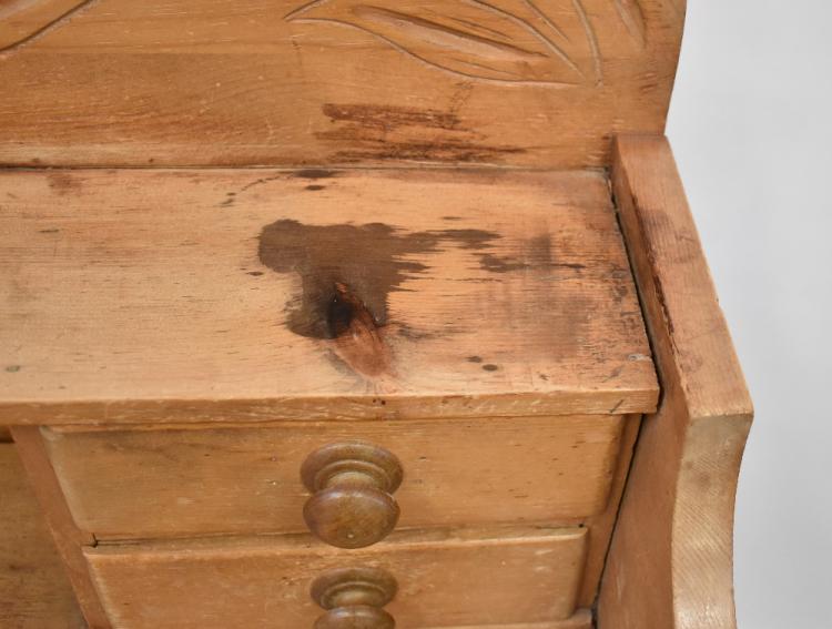 Lot 27 of 1098: An early 20th century pine sideboard with arched back with carved decoration above a shelf flanked by pair of spice drawers, above three cushion drawers with central panelled door flanked by pair of deep drawers, raised on turned bun feet, 153 x 150 x 55cm.