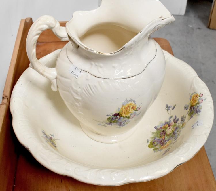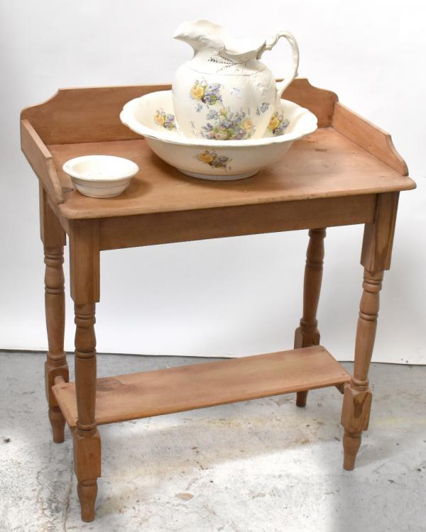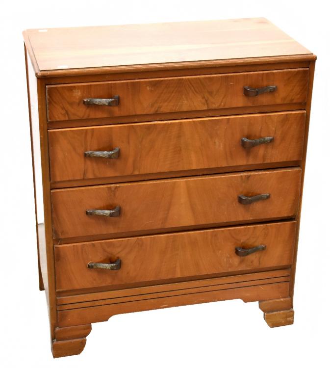 Lot 28 of 1098: An Edwardian pine two-over-three chest of drawers to bun feet, 81 x 89cm, a contemporary walnut veneered four-drawer chest of drawers, to bracket supports, 90 x 77cm, and an Edwardian pine wash stand with lower shelf to turned supports and peg feet, 83 x 75cm, with an Edwardian wash bowl and jug to the top (4).