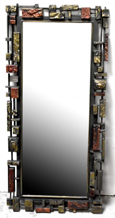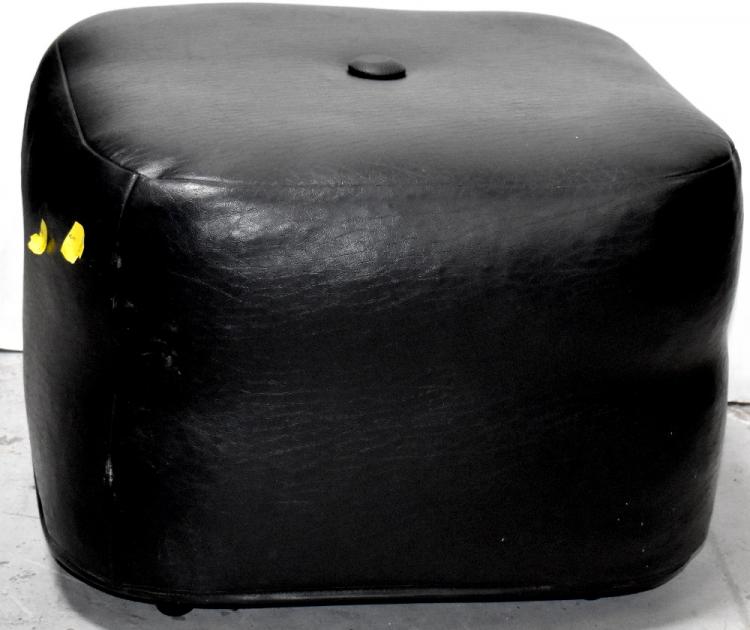 Lot 52 of 1098: A 1970s/80s brushed aluminium and smoked glass trolley table, a vintage wall mirror with textured block border, a vintage leather pouffe on castors, a chrome circular framed stool and a three-piece stainless steel tea/coffee set comprising tray, milk jug, sugar bowl, coffee pot and teapot (5).
