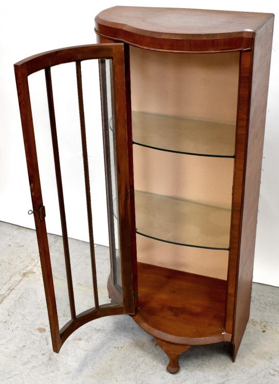 Lot 64 of 1098: A 1940s walnut corner glazed display cabinet of shaped form, formerly from a larger piece of furniture, with single glazed door enclosing pair of glass shelves, raised on squat cabriole legs, 125 x 57 x 39cm.