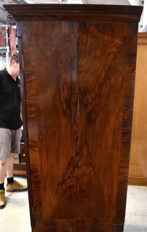 Lot 65 of 1098: A walnut crossbanded and herringbone inlaid linen press with pair of panelled doors above two short and two long drawers, to bracket feet, 188 x 117 x 55cm (af).