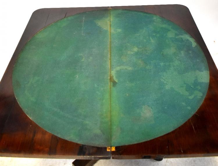Lot 16 of 875: A 19th century mahogany fold-over games table, when opened circular green baize top to octagonal baluster and quadripartite support, to turned ornamental feet, when extended 76 x 92cm.