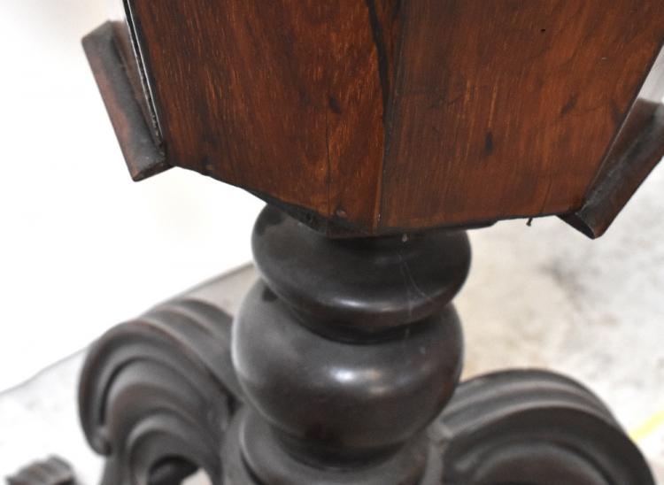 Lot 18 of 875: A 19th century mahogany octagonal sewing box with lift-out tray and interior check lining, to central baluster and tripartite support to paw feet, height 77cm, diameter 50cm.