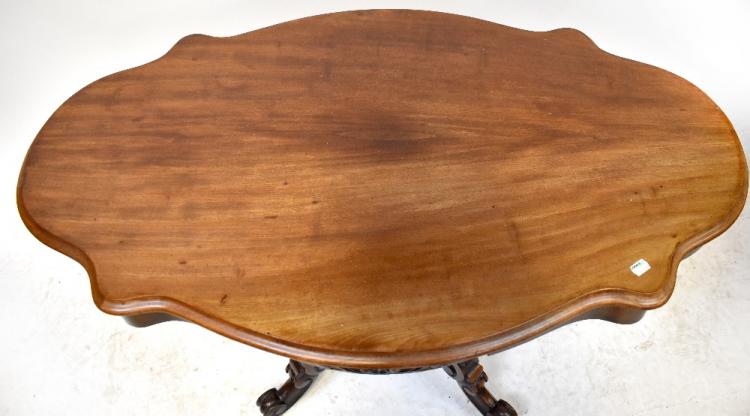 Lot 37 of 875: An late 19th century walnut centre table of small proportions, the shaped top with opposing frieze drawer with carved foliate decoration, raised on bulbous supports and quadripartite base of outswept scrolling supports, 69 x 114 x 69cm.