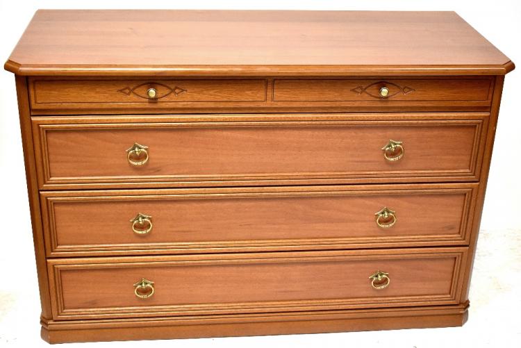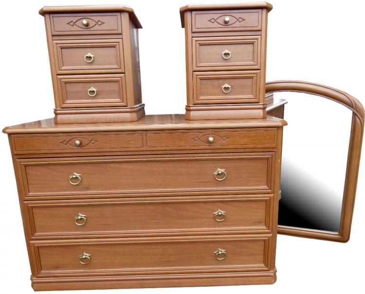 Lot 50 of 875: A modern four-piece bedroom suite to include a pair of three-drawer bedside cabinets, height of each 53cm, width 44cm, a chest of four long drawers, height 84cm, length 130cm, and a matching wall mirror, 103 x 87cm.