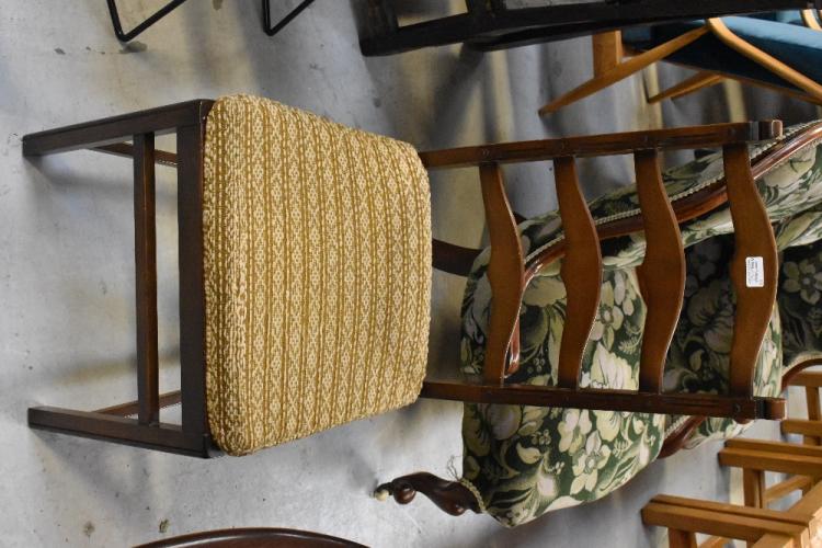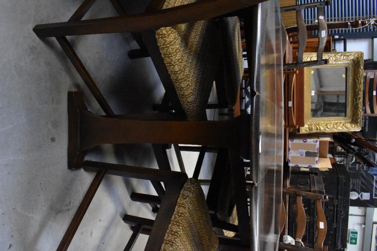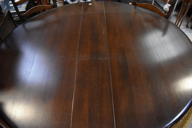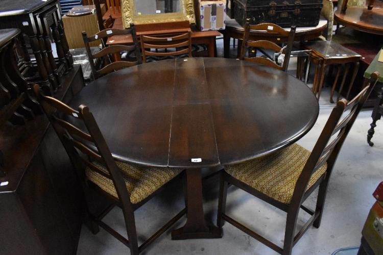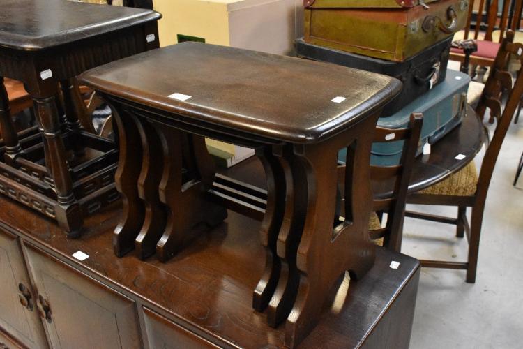 Lot 62 of 875: ERCOL; a dark stained dining suite comprising a Sutherland-style drop-leaf table, a set of four ladder back chairs, a sideboard with three panel doors above a pair of drawers and a nest of tables (7).
