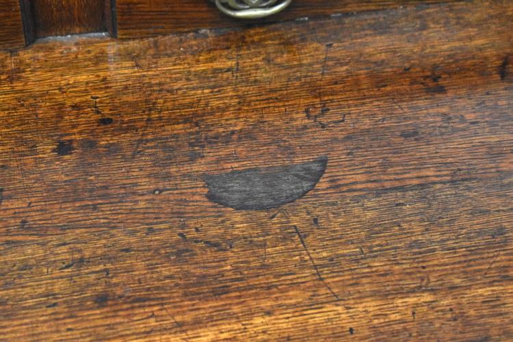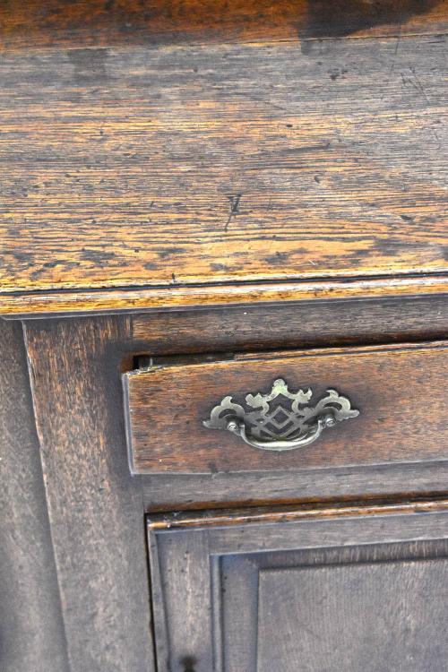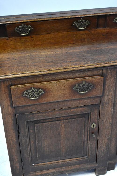 Lot 3 of 1053: A George III style oak break-front sideboard comprising galleried back of three drawers above central section with three drawers flanked by single drawer above a fielded and panelled cupboard to each side, on stile feet, all with pierced brass drop handles, 80 x 195 x 50cm.
