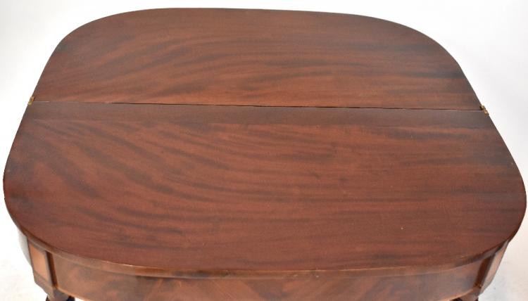 Lot 21 of 1053: A 19th century mahogany fold-over tea table to tapering supports and peg feet, length when extended 84cm.