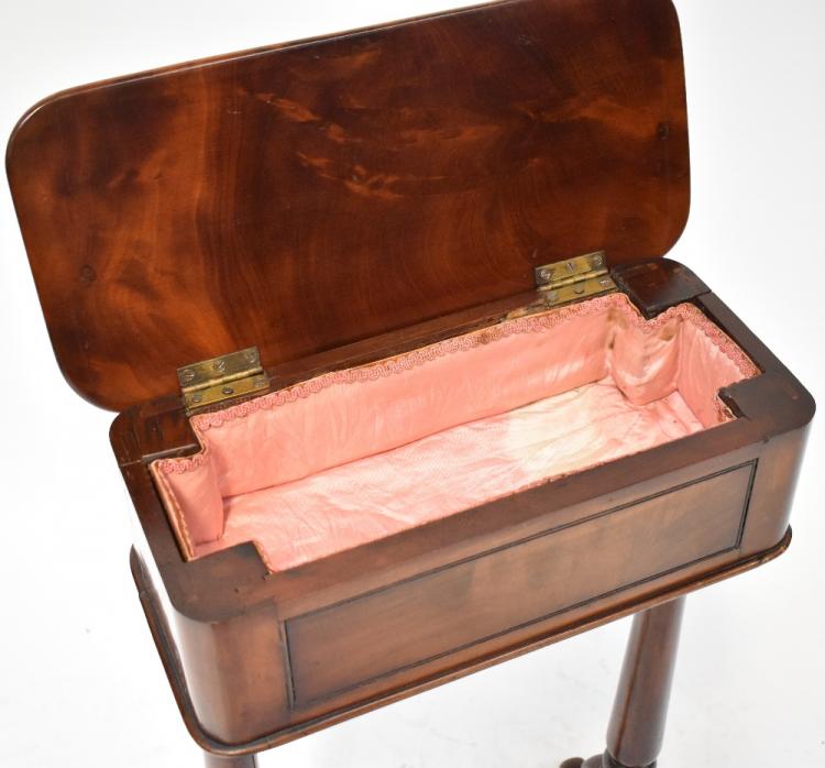 Lot 25 of 1053: A 19th century mahogany rectangular sewing box, to tapering baluster supports and cross-stretcher, 70 x 44 x 21cm.