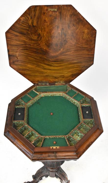 Lot 35 of 1053: A 19th century walnut octagonal sewing table, green and gilt original paper lining, green ground with golden oak leaves, various compartments for sewing aids and large central storage unit, to octagonal base with acanthus leaf carved circular support to tripartite base, height 74cm.