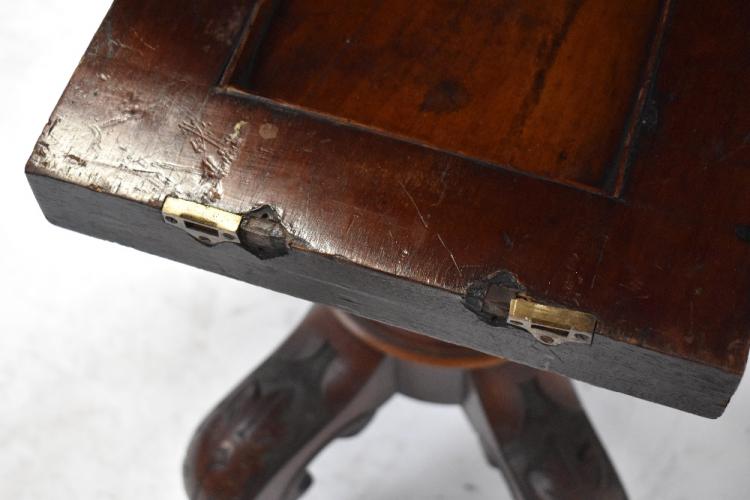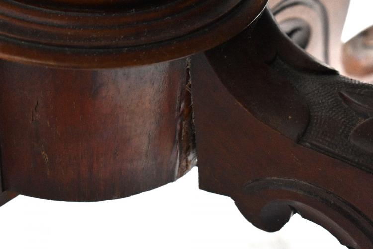 Lot 37 of 1053: A late 19th/early 20th century mahogany oval dining table on turned baluster and quadripartite carved supports to castors, length 127cm and four Victorian mahogany balloon back dining chairs with carved and floral back rail, overstuffed seats to front cabriole supports, to ball and claw and peg feet (5).