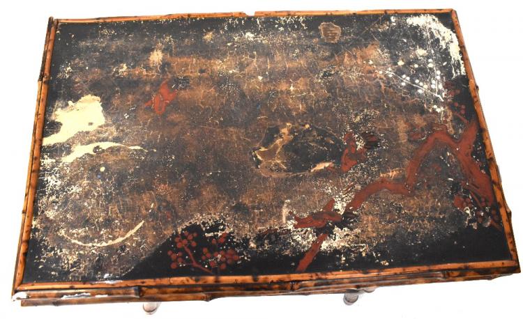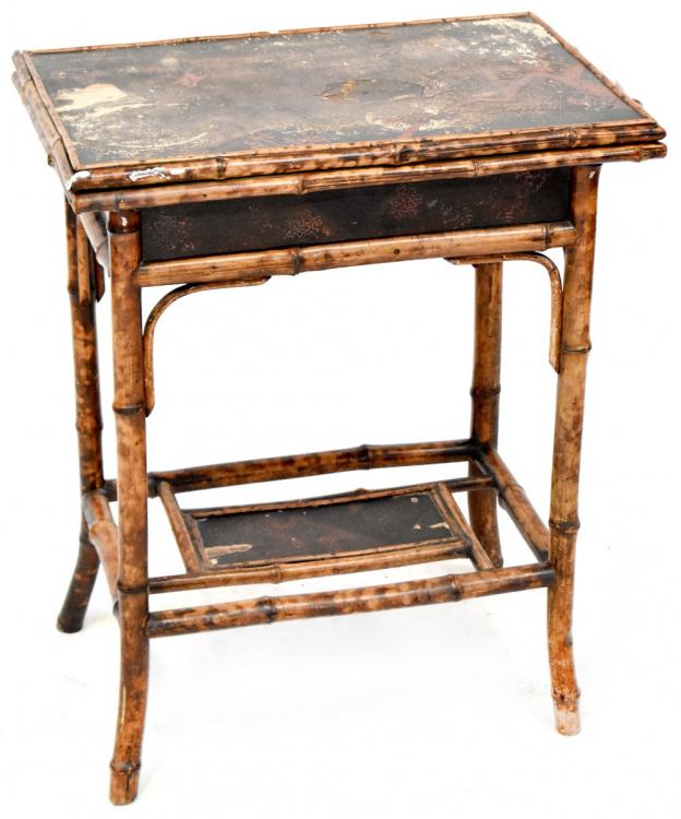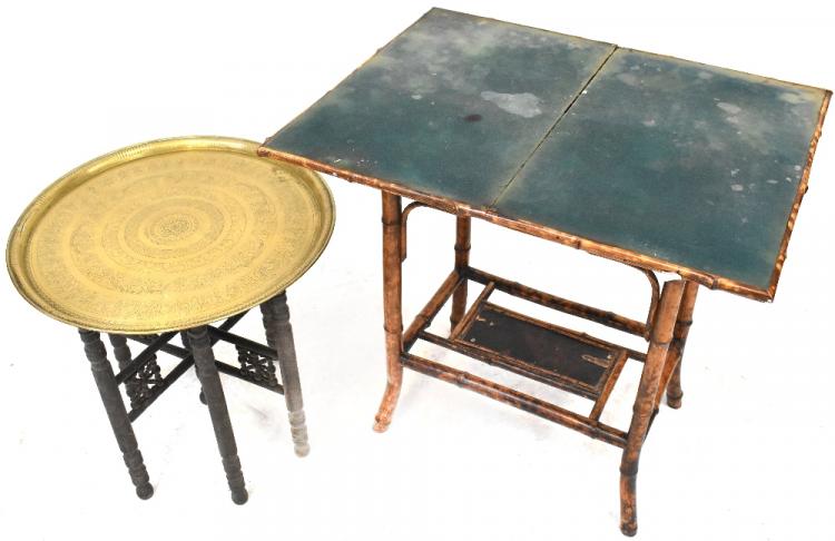 Lot 41 of 1053: A Victorian bamboo fold-over card table top with Oriental decoration (af), lower shelf to outswept bamboo supports, when extended 78cm, and a 19th century Indian large circular brass table top to folding hardwood support, diameter 58cm (2).