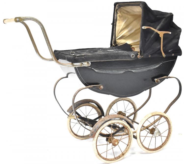 Lot 50 of 1053: Two late 19th/early 20th century children's chairs, a bent wood example with bergère seat and a country style oak Windsor chair to outswept turned tapering supports, also a vintage Silvercross dolls' pram (af) (3).