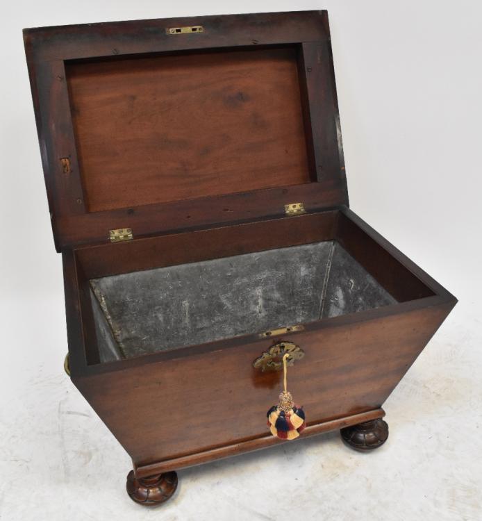 Lot 51 of 1053: A Regency mahogany cellarette of sarcophagus shape, with stepped lid exposing lead-lined inner, on tapered body with brass swing handles and a fretwork brass lock embellishment, on flowerhead bun feet raised on brass castors, 48 x 66 x 46cm.