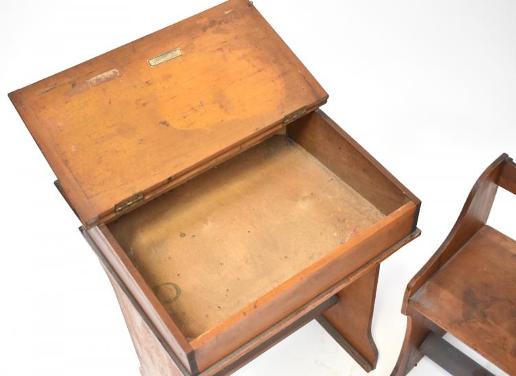 Lot 52 of 1053: An early 20th century child's desk with push-under seat, inkwell hole and pen rest to the top of the desk, lift-up desk to block supports, 64 x 51 x 41cm, chair height 57cm (2).