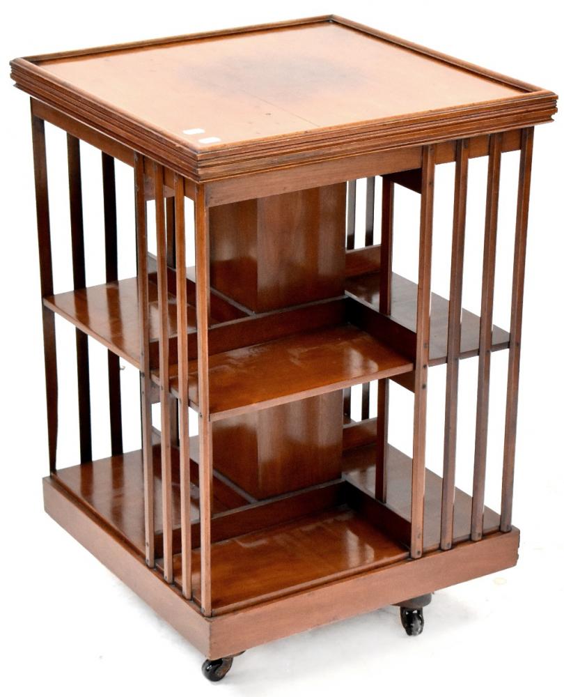 Lot 64 of 1053: An Edwardian walnut revolving bookcase to baluster supports and castors, 82 x 53 x 53cm.
