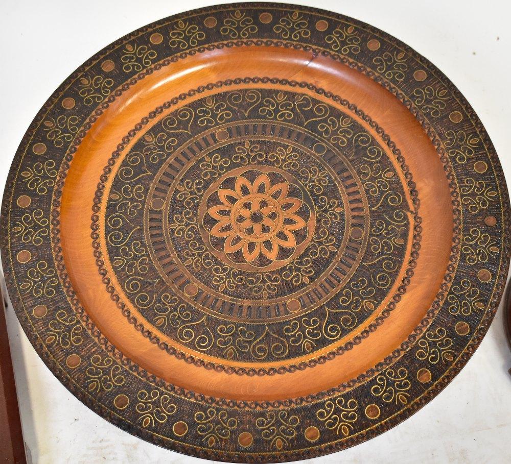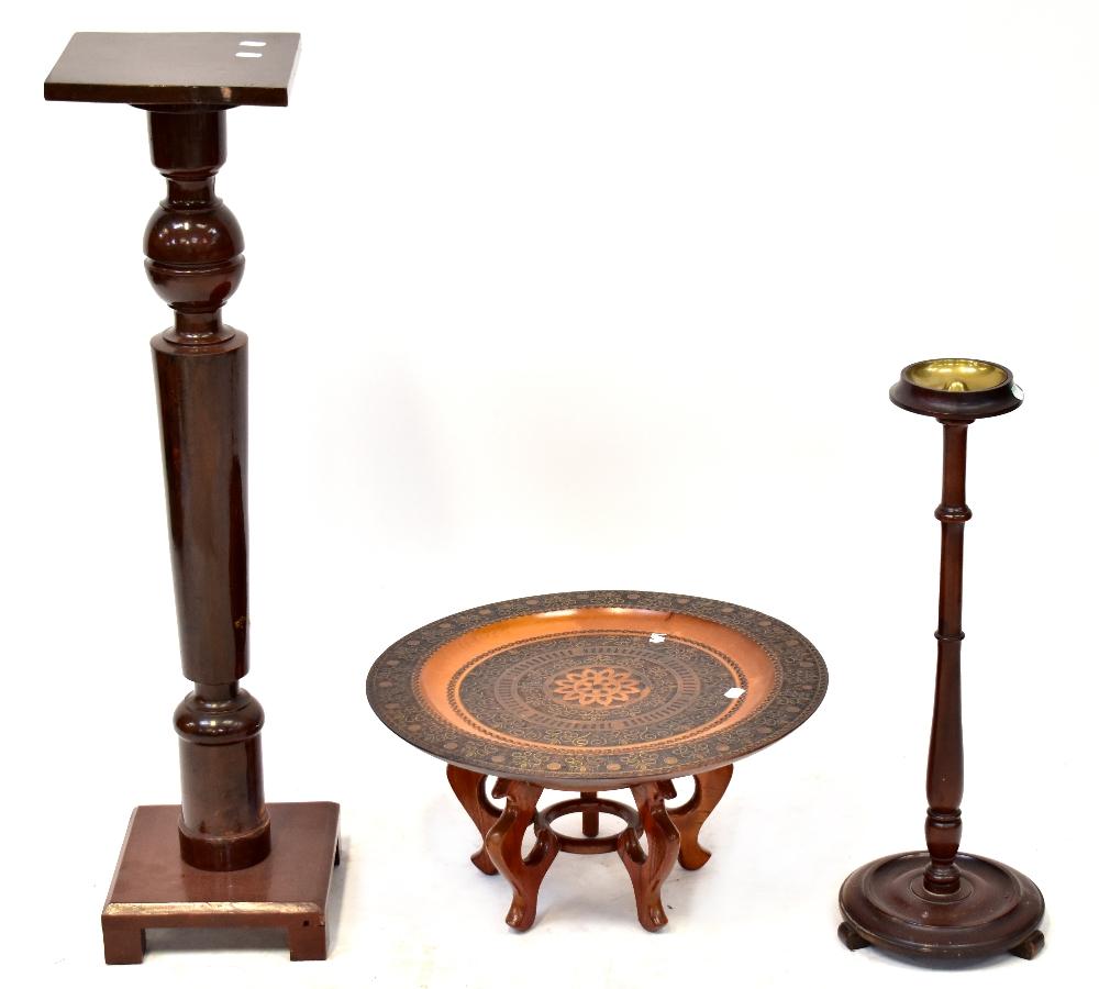 Lot 66 of 1053: A 20th century mahogany Edwardian-style jardinière, square plant stand to tapering turned column supports and square base to block feet, height 96cm, a mid-20th century mahogany cigarette stand with brass inlay, height 62cm and a modern carved wooden charger in the Indian style, diameter 50cm (3).