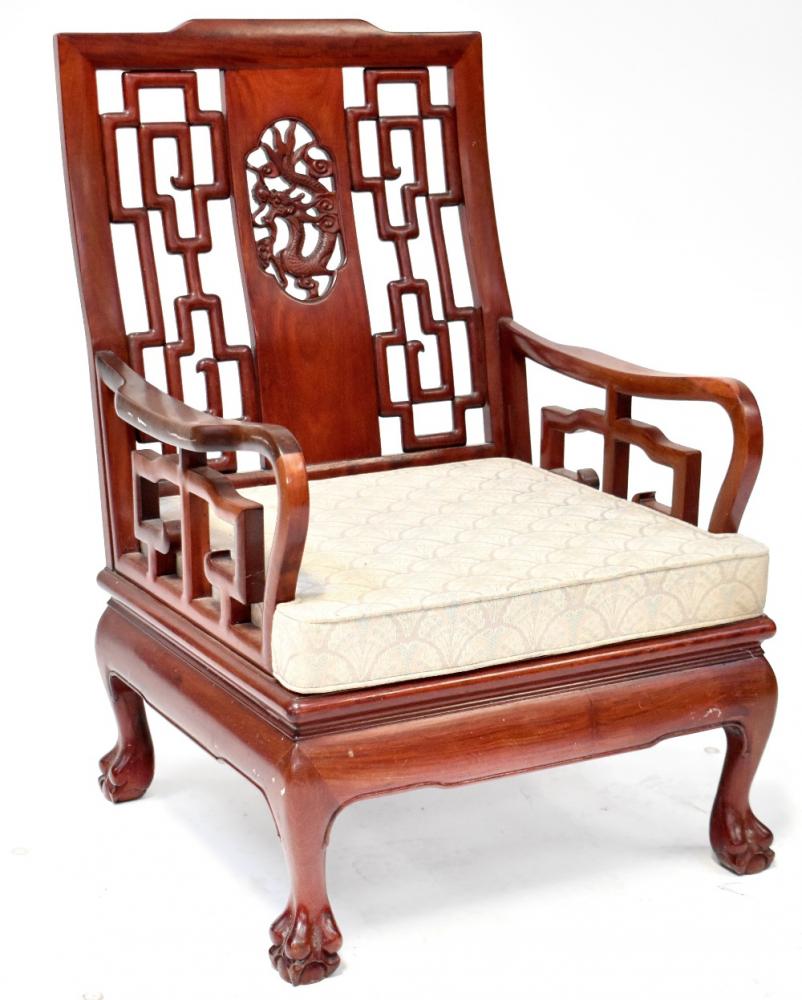 Lot 72 of 1053: A modern Oriental hardwood open arm elbow chair with lattice back decoration centred with a dragon, raised on cabriole supports to ball and claw feet.