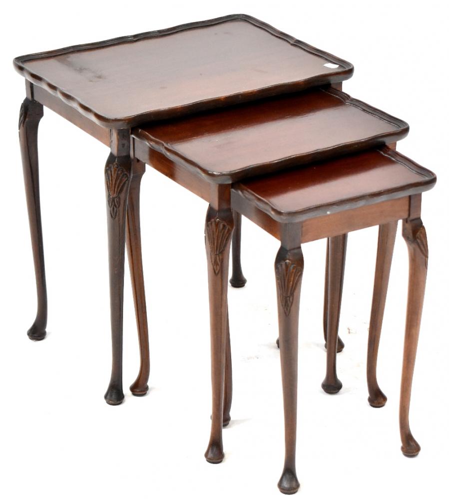 Lot 73 of 1053: A nest of three mahogany side tables, each with carved shell kneecaps, tapering cabriole supports and pad feet, largest 55 x 50 x 37cm.