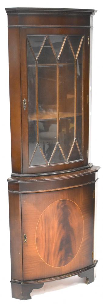 Lot 77 of 1053: A reproduction mahogany floor-standing corner unit, with curved top rail above astragal glazed door, two interior shelves, above single bow-front cupboard with string inlay, to shaped plinth base, height 179cm, width 70cm.