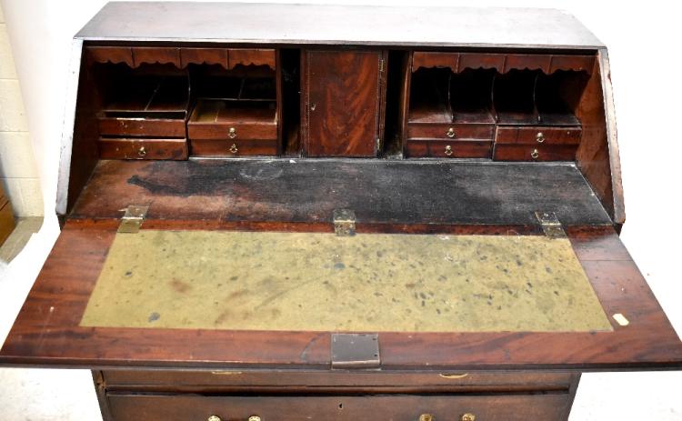 Lot 1 of 998: A George III mahogany two-over-three long drawer drop-front bureau, with partially fitted interior.