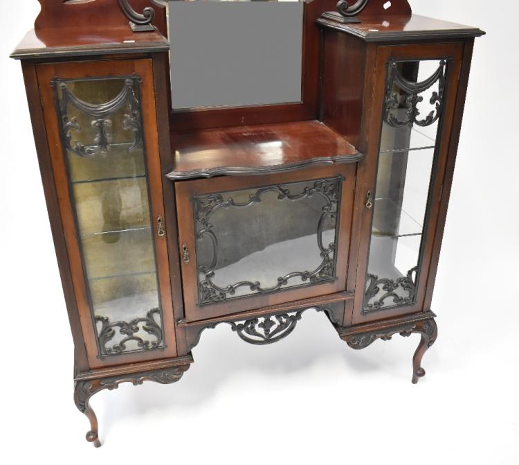 Lot 17 of 998: A Victorian mahogany mirror back display cabinet, shaped mirror above heavily carved canopy, with teardrop mirror to either side, above recessed central glazed door, with longer glazed door to either size, glazed sides to cabinet, each glazed door with applied carved swag and acanthus decoration, to cabriole supports and peg feet, 220 x 120 x 40cm.